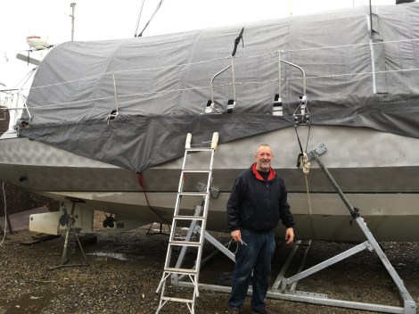Having seen boats in Sweden with purpose-made winter covers, we decided to make one for Grey Wanderer. Our local club yard is great in a lot of ways, but it is quite dirty, and “blessed” with a huge number of starlings, who like to deposit their droppings all over the boat. So Jane designed and planned an overall winter cover. It would have been prohibitively expensive to have one made, so she set to with our domestic sewing machine, and after a couple of months, and a few trial fittings, this was the result.
